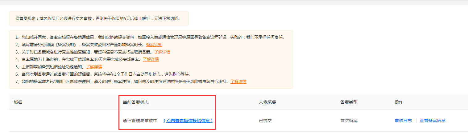 根据工信部要求,自2020年8月17日起,中国内地(大陆)提供服务的网站进行备案时需进行短信核验,您提交备案申请通过接入商审核后,会收到工信部发送的核验短信,您需要在收到短信的24小时内完成短信核验,备案申请才能进入管局审核。